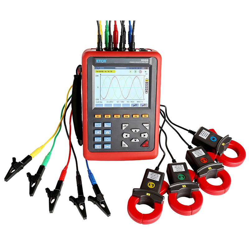 ETCR5000電能質(zhì)量分析儀是我公司精心研制的一款專為現(xiàn)場(chǎng)測(cè)試的三相、多功能、智能化、人機(jī)操作簡(jiǎn)潔的綜合型測(cè)試儀器。具有容易使用,超大液晶彩屏顯示,高分辨率,中英文雙語(yǔ)操作界面,防振結(jié)構(gòu)外殼等特點(diǎn)??赏瑫r(shí)測(cè)量4路電流(ABC三相及中性線電流),4路電壓(ABC三相電壓及中性線對(duì)地電壓)、電流電壓的峰值、一段時(shí)間內(nèi)的蕞大蕞小值、三相不平衡度、短時(shí)電壓閃變、變壓器K因數(shù)、有功功率、無功功率、視在功率、功率因數(shù)、位移功率因數(shù)、有功電能、無功電能、視在電能、諧波比、總諧波失真度等;顯示電流電壓的實(shí)時(shí)波形、相量圖、諧波比柱形圖;動(dòng)態(tài)捕捉電壓電流瞬時(shí)變化,監(jiān)測(cè)啟動(dòng)電流,監(jiān)測(cè)各電力參數(shù)并生成告警列表,長(zhǎng)時(shí)間記錄測(cè)試數(shù)據(jù)并生成趨勢(shì)曲線圖等功能。