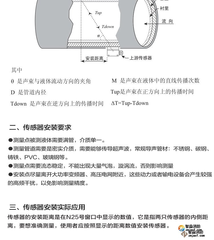 超聲波流量計(jì)的傳感器一般采用V方式和Z方式安裝,通常情況下,管徑小于300mm時(shí),采用V方式安裝,管徑大于200mm時(shí),采用Z方式安裝。對(duì)于即可以用V方式安裝又可以Z方式安裝的傳感器,盡量選用Z方式。實(shí)踐表明,Z方式安裝的傳感器超聲波信號(hào)強(qiáng)度高,測(cè)量的穩(wěn)定性也好,圖2。