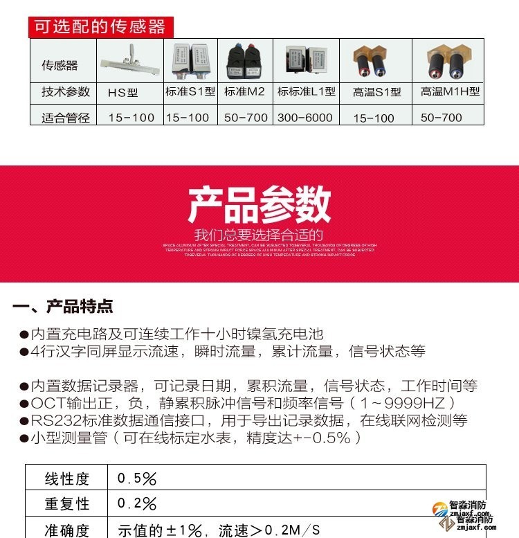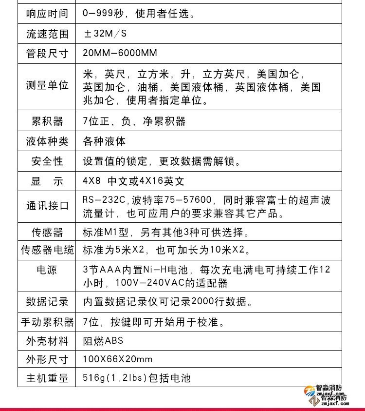 超聲波流量計(jì)測(cè)量管徑范圍:0mm~300mm;WWW.XFJCYQ.COM精度:±1%用于檢測(cè)消火栓系統(tǒng)和水噴淋系統(tǒng)的給水量以及消防豎管的流量分配。
