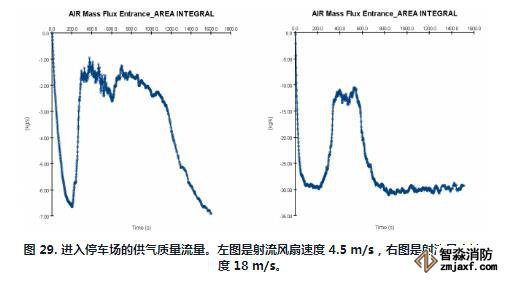 這種影響可以在圖 29 中看到,即入口空氣質(zhì)量通量的繪圖。在這里,我們展示了一個慢速和快速風扇案例。在這兩種情況下,當火災開始時,流入模型的新鮮空氣會顯著減少。隨著熱空氣的排出,新鮮空氣流量再次增加。