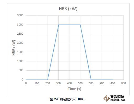 在這個例子中,我們使用了一個很黑的火,代表聚氨酯 GM27 的燃燒。煙灰產(chǎn)量是0.198導致大量煙霧的原因?;鸬谋砻娣e為,每單位面積的峰值熱釋放速率為,給出的峰值熱釋放速率 (HRR) 為。3000 kW 值是根據(jù) Jones 等人的論文選擇的。使用簡單的上升到峰值 HRR 和下降。選擇這個時間歷史是為了加速計算6 m2500 kW/m23000 kW