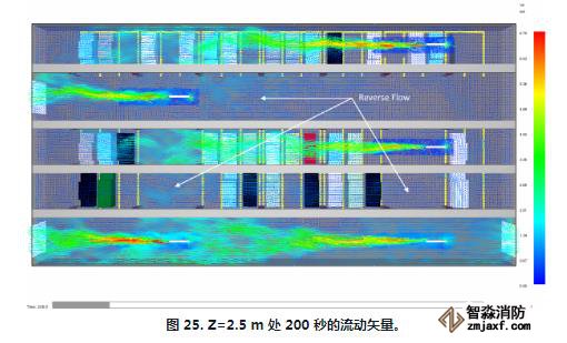 查看火災開始前的初始流動模式。 圖 25顯示了快速風扇 ( 18 m/s) 情況下的相應流動矢量。在這兩種情況下,主流都是朝向排氣出口,但在風扇之間的通道中有一些反向流動。等高線顯示在以 Z = 為中心的風扇正下方2.75 m(天花板位于 處3 m,梁的下邊緣位于 Z = 處2.5 m)。找到?jīng)]有反向流動的風扇配置并不簡單,需要進行設計計算。