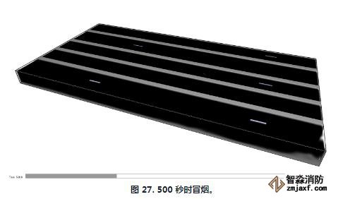 火開始于200 s,達到峰值300 s,停留在峰值到500 s,然后結(jié)束于600 s。在250 s,當聚氨酯 GM27 火災僅達到其峰值的一半時,煙霧已經(jīng)蔓延到停車場的大部分區(qū)域,如下圖所示。 圖 26確實表明,由噴射風扇產(chǎn)生的氣流傾向于將煙霧推向出口。然而,500 s對于這兩種情況,煙霧全部填滿了停車場。